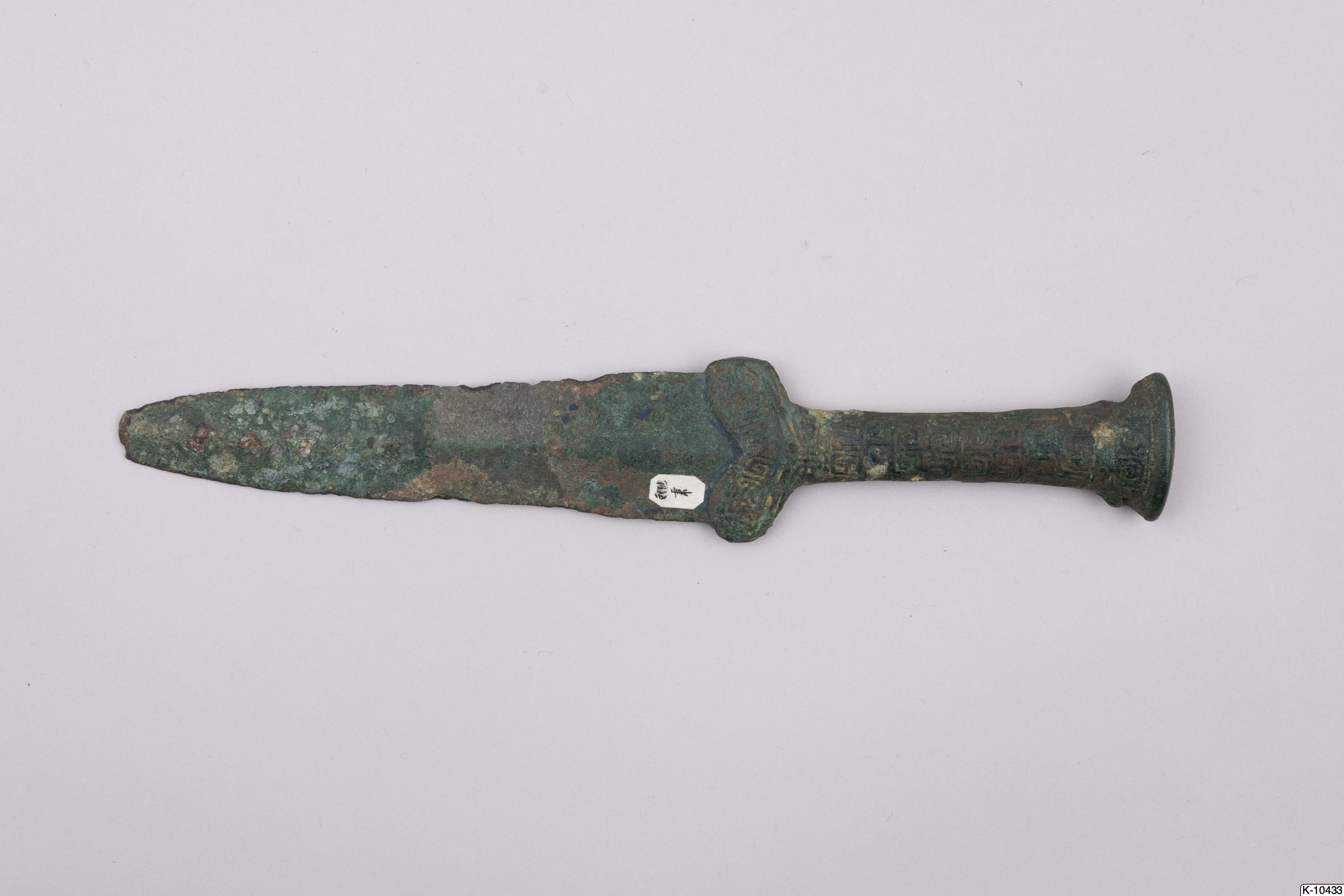 Dolk. Fästet utgörs av två blad med meandermönster. Hela kavlen dekorerad med meandermönster, kavlen svänger ut uppåt, toppen tillplattad. På vardera sidan nedanför huvudet ett ej genomgående hål.