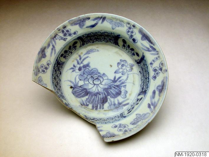 Litet fat med fördjupning och tydligt brätte, påminner om NM-1921-0316. Dekor föreställande blommor (lotus), vattenväxter, etc. Skadad, ca en fjärdedel bortslaget. Diameter, 16,5 cm. Blåvitt porslin.