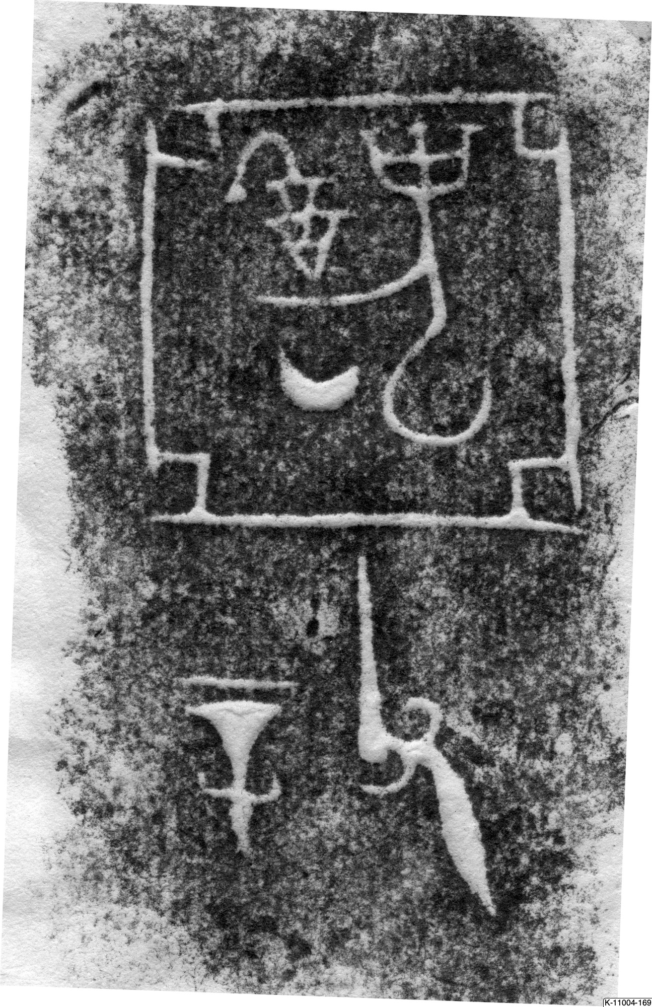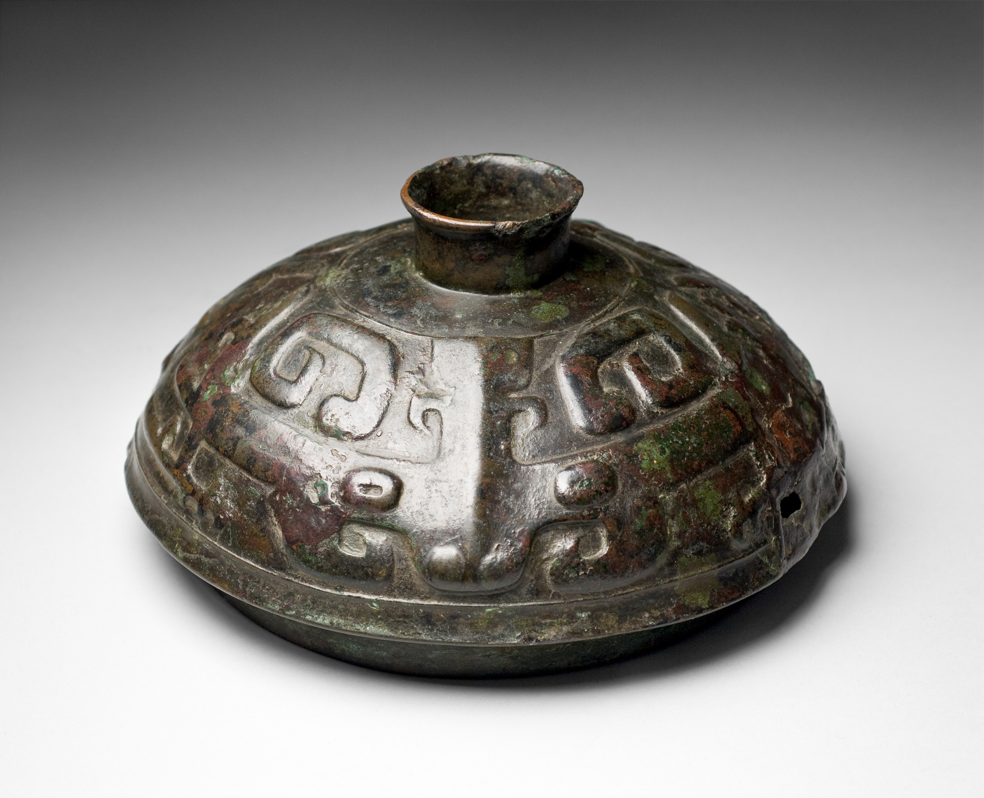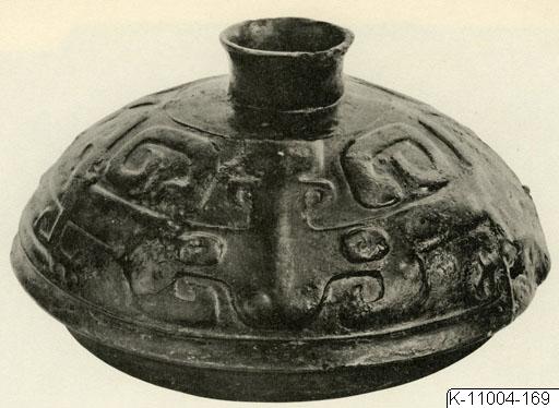 Lid for sacrificial vessel, decorated with taotie-masks in relief. Inscription: Ya Chou (clan name) Fu Xin (“Father Xin”) 亞醜父辛. Polished with few remnants of patina. Diam.: 22.5 cm InnWeight: 2118.5 g. Late Shang/ early Western Zhou. K-11004-169 Purchased by J.G. Andersson autum 1927 in Tianjin from Luo Zhenyu 1927. Publ.: Luo Zhenyu 1918.11a-b; Karlgren 1949, Pl. 15:1; Rawson 1991, p. 362. Luo Zhenyu indicates that the lid originally belonged to a yan (steamer)(Luo Zhenyu 1918, List of content). Rawson suggests that the lid originally belonged to the Ya Chou gui, formerly in the von Lochow Coll. (Rawson 1991, p. 362.)