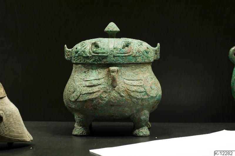 K-12282 You - wine vessel, with lid, for sacrificial use. Bronze. Vessel in the shape of two owls, standing back-to-back. Elliptical cross-section.The lid representing the birds´ heads. with two taotie-masks in relief. The body with four small legs and two handles. The birds' wings in relief. The knob of the lid decorated with cicadas. Shang, Middle Anyang Period. Extensive repairs. Greenish patina with reddish spots. Incrustations.