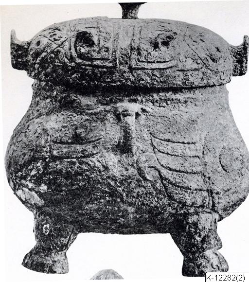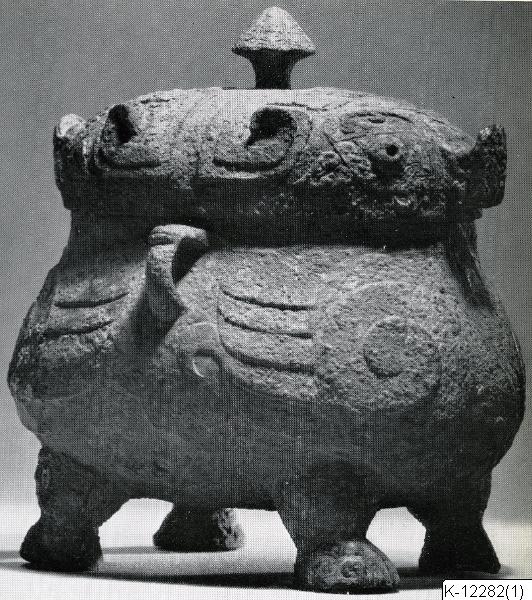 K-12282 You - wine vessel, with lid, for sacrificial use. Bronze. Vessel in the shape of two owls, standing back-to-back. Elliptical cross-section.The lid representing the birds´ heads. with two taot...