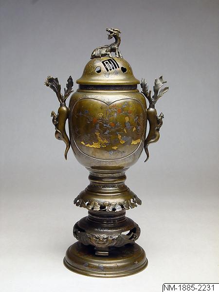 Rökelsekar på fot. Omfattande dekor. På sidorna bl.a. två rättikor (eller annan rotfrukt) varpå det sitter råttor (eller ekorrar), på sidorna en figurscen med inlagd metall och på locket qilin / kirin .