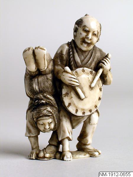 Netsuke av ben, möjligen elfenben, från Japan. Netsuke, en snidad knapp på snodd att hänga i bältet blev under Edo-perioden (1615- 1868) en av den manliga dräktens viktigaste prydnader. OBS! Föremålen är ej inmärkta. Enligt montertext “Underhållare stående på händerna och en med trumma”. Signerad Ikkosai. Kimonon har inga fickor, småsaker kunde läggas i ärmarna och innanför bältet och så kunde man bära olika dosor, pipor och penselfodral på en snodd från bältet. De bärbara sakerna kallas sagemono. Accessoarerna blev särskilt för männen identitetsskapande statusföremål och en viktig del av herrmodet, en egen värld i mindre skala med rika motiv. Olika typer av konstnärligt utformade sagemono är kända fr o m 1600-talet. Förutom tobaksrelaterade dosor är en av de mer kända typerna sigilldosor (inro). Bokstavlig betydelse är en korg (ro) att lägga sigill (in) i. Enligt lag var endast stämplade signaturer giltiga vilket krävde att t ex samurajer och köpmän som hade behov av sigillstämplar fick bära dem med sig i små dosor. Detta var ursprunget till sigilldosor (inro) som snart främst kom att användas för medicinförvaring. Utseendet på accessoarerna varierade efter bärarens smak, ekonomi och modetrender. När västerländsk klädsel med fickor blev populär under Meiji-perioden (1868-1912) minskade behovet av dessa bärbara föremål och de delades ibland upp i sina beståndsdelar (netsuke, s k bältesknappar) för sig och såldes till västerlänningar. (Baserad på text från utställningskatalogen Japan. Föremål och bilder berättar. 2011). Miniatyrskulpturerna, ofta kallade bältesknappar, (netsuke) rymmer en hel värld att utforska. Myter är ett stort motiv. Ofta var designen lyckobringande och inte minst underhållande. Netsuke-föremålets funktion består i att vara en motvikt till de "hängande saker" (sagemono) som bars till kimonon av männen. Vanliga hängande saker var olika dosor, till exempel medicindosor (inro) och tobakspungar. Netsuke betyder ungefär "fästa rot" och tidiga netsuke (före sent 1600-tal) var förmodligen naturliga, obearbetade rötter och liknande. Från 1700-talet gjordes de mer föreställande och ofta i trä eller elfenben. Så småningom började konstnärerna att signera sina netsuke. (Baserad på text från utställningen Japan. Föremål och bilder berättar. 2011). /PH