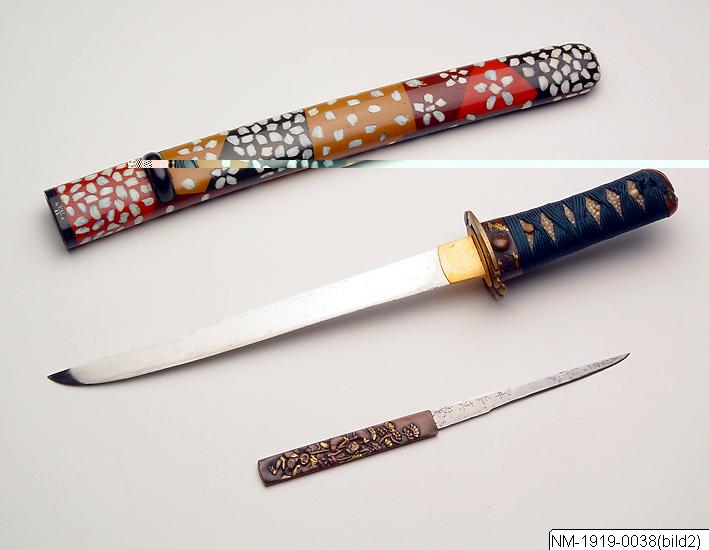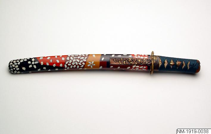 Enligt katalogkort: “Dolk lackerad slida med inlagda hajtänder, handtag med omvirat hajskinn. Japan, 1800-talet.”