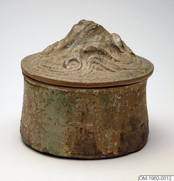 Lian urna av lergods. Cylindrisk form, upptill något indragen. Locket format som ett berg resande sig ur havet. Rött lergods täckt av grön, iriserande glasyr.