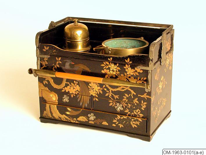• Ett schatull för rökverk. Svart lackgrund (roiro) med takamaki-e i silver, guld och rött lack samt med kirikane och inlägg av pärlemor. Två mässingsbehållare, en bredare för glödande kol (hibachi) för att tända pipan och en smalare för att tömma pipans aska (haifuku). Lådornas silverknoppar är formade som körsbärsblommor. Pipan består av ett bamburör (rao) samt huvud och munstycke i mässing.
