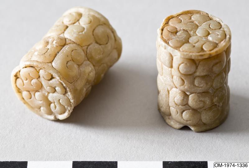 Enligt katalogkort: Två små cylindrar med en volutdekor i låg relief. Material: Marmor av ljust brunaktig färg. Tillverkningsort: Shouzhou. Närmare tidsbestämning: Huai.