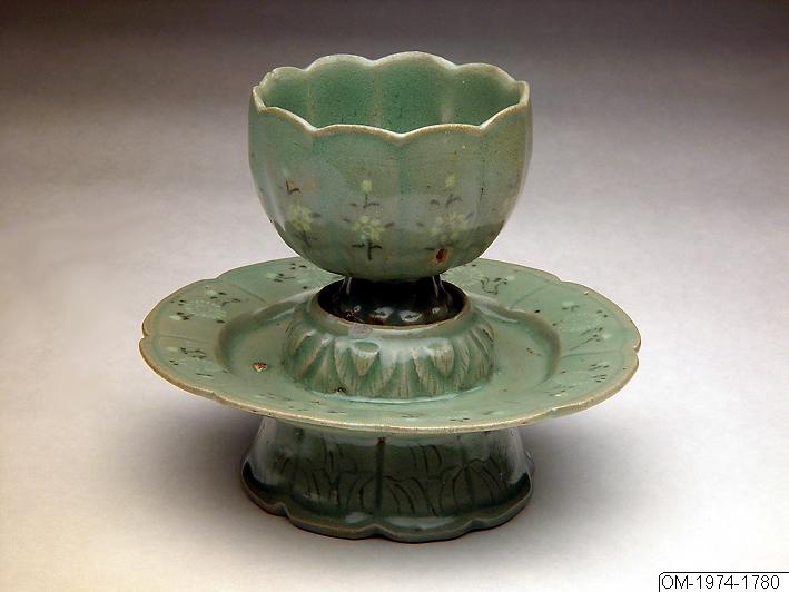 This object consists of a cup and a stand. The cup has a high foot and was embossed (possibly by using a mold) into a ten-lobed floral shape, which continues down to the foot. Each section of the lobed walls is adorned with an inlaid design of a chrysanthemum spray in white and black slip (red ocher slip was used and fired to a black color). This inlay technique is called sanggam in Korean. The floral decoration is enclosed at the top and bottom with a set of finely incised double lines. The interior is undecorated. The foot is flaring at the base. The base was wiped free of glaze and bears traces of glaze and faint scars from gritty clay pads that supported the cup during firing. The platform, the cup is placed on, is raised and has a circular ridge to prevent the cup from sliding off the platform. The flat area on the platform bears an incised spiral motif. A carved lotus petal design encircles the raised platform. The section below the platform is shaped like a saucer with lobed edges, consistent with the lobed design of the cup. The broad rim along the edge of the saucer is decorated with a chrysanthemum spray in every section. The stand has a high, lobed foot with incised lines, probably representing leaves or grass. A greenish-tinged (celadon) glaze covers both the cup and the stand. There are remains of three gritty clay pads placed inside the footrim, on a horizontal ridge where the foot meets the saucer section of the cup stand. Although similar, the decoration on the cup and stand are slightly different, which may indicate that this set was "married" at a later date. There are two different shapes of cup stands from the Goryeo period (918-1392), both originating from China. This object belongs to the group of stands with a raised platform. The second type of stand has a cradle the cup is placed into instead of a platform (see OM-1968-0102). Cups with stands of the same design were produced in metal during the same period. The technique of embossing the sides of the ceramic cups derived from the metal prototypes. Used as a household utensil by the aristocracy, this cup and stand set would have been used for drinking tea on the occasion of social gatherings. This object was produced in the kilns of Gangjin, in the South Jeolla Province. Gangjin, alongside Buan (North Jeolla Province) and Haenam (South Jeolla Province), was a major center for ceramics production from the 11th to the 14th centuries. Gangjin wares were known to be of the highest quality, and artefacts that are believed to originate from the kilns in Gangjin have been discovered at the sites of royal palaces and tombs, as well as Buddhist temples.