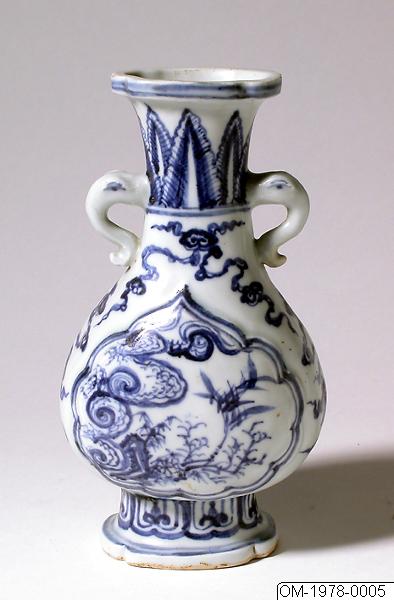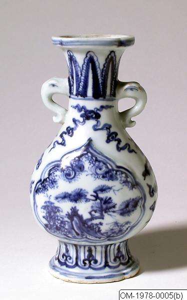 Vaser, par, porslin, underglasyrblå dekor av trädgårdsklippa och växter. Ming-dynastin, tidig. Gåva genom Kinakommittén. ÖM-1978-0005