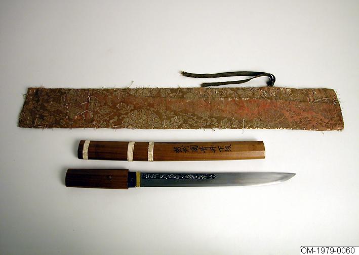 Dolk (tanto eller snarare aikuchi, eftersom vanlig tsuba saknas) med förvaringsbalja av trä (shirasaya) samt textilfodral. Enligt kataloguppgift ”Klinga av mycket hög kvalitet med genombruten horimono med drake kring ken. Shimosaka-skolan. Signerad: Echizen-(no)-Kuni-Shimosaka. 1600-tal. På grund av ett mon på habaki (kragen på tsuba) finns anledning anta att klingan troligen tillhört prinsen av Satsuma”.
