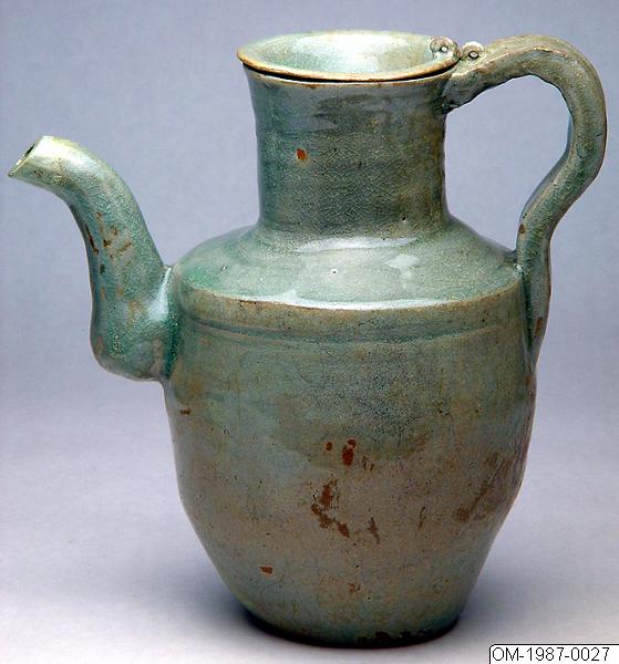 Kanna med skålformat lock. Stengods med krackelerad celadonglasyr. Glasyren är flammig i gulgröna skiftningar och har runnit. På kroppens ena sida ristad dekor av fåglar. A. Kalbaks samling (inköp) Lagad på locket och vid kannans pip.