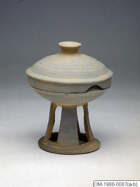 This bowl is raised on a high pedestal and covered with a lid. The lid has a pedestal-shaped knob with flaring sides and a flat top. The sides of the lid slope down to a protruding band at the edge of the shoulder above a flange. The lip of the bowl has a straight rim (flange) above a ridge (gallery) for holding the lid in place. The sides of the bowl taper down in a curve to the base. The hollow pedestal foot has four equidistant, large, rectangular cut-out. The clay is refined and fired to a dark-greyish colour. The surface was smoothened with the help of a potter's wheel. Large numbers of Silla and Gaya pottery vessels unearthed from tombs in the Gyeongsang Province are vessels raised on pedestal stands (with or without lid) with cut-out openwork decoration like the above-described. Alternating, rectangular cut-outs are characteristic for Silla pottery, whereas aligned cut-out designs and triangles are more typical for pottery of the Gaya confederacy. The pedestals were either an integral part of the vessel or were produced separately with a bowl-like cradle so that a ceremonial vessel with a round bottom could be placed on top. These pedestal bowls probably held foodstuffs as an offering for the deceased during funerary ceremonies and were placed into the tomb. Offerings of food, daily utensils or precious items were a common funerary practice during that time as it was believed that they ensured material abundance and well-being of the deceased in the afterlife.