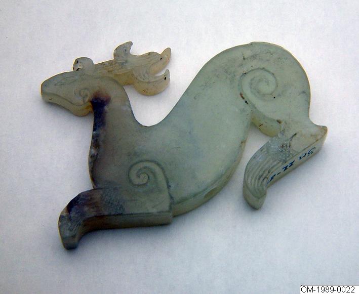 • Ett par hjortar av jade. Ben och horn med ingraverad striering. Hjortarna identiskt skurna på båda sidor. Båda med hål för upphängning vertikalt genom kroppen.