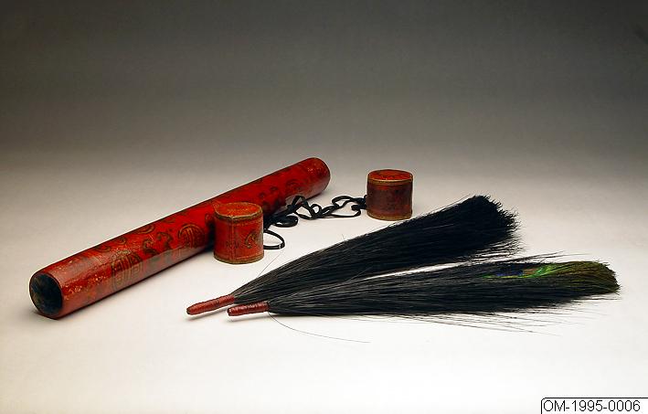 Två påfågelsfjäder för ämbetsmannahatt. Inköpt från Freddy Hansen antikviteter Köbenhamn.
