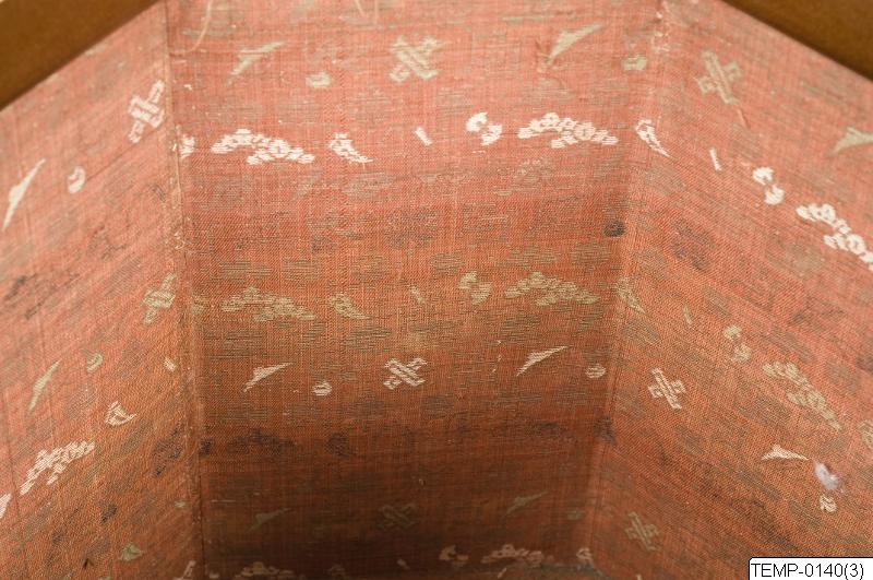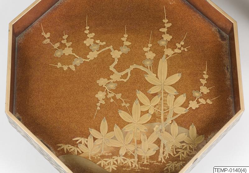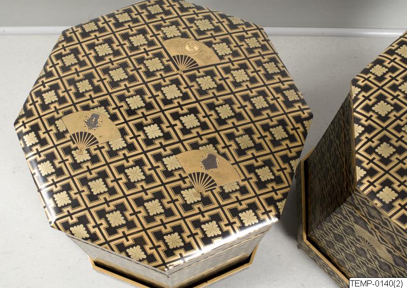 En av två stycken stora askar av lackerat trä, från Japan. Askarna är åttkantiga, svartlackerade och har dekor i guldlack av solfjädrar mot bakgrund med geometriska mönster med blommor. Varje ask består av tre delar; lock, ask samt ställ. Askarnas insida är klädd med textil. Stället är dekorerat med nashiji-bakgrund samt körsbär och tallskott i guldlack. Inuti en av askarna fanns vid tillfället för registrering en lapp med påskriften “18th c.” varför man kan anta att askarna är från 1700-talet.