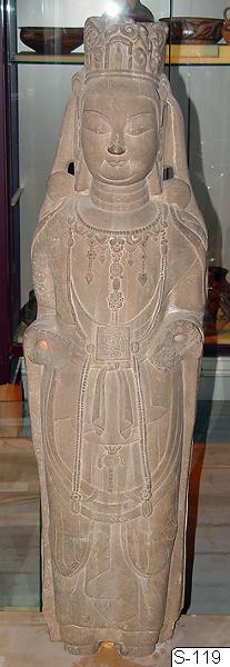 • Skulpturen står monterad på en eksockel. På sockeln finns en etikett med texten “Stående Kuanyin Bodhisattva. Sandsten. T’ang (618-906 e.Kr.)”