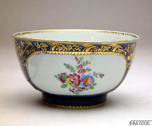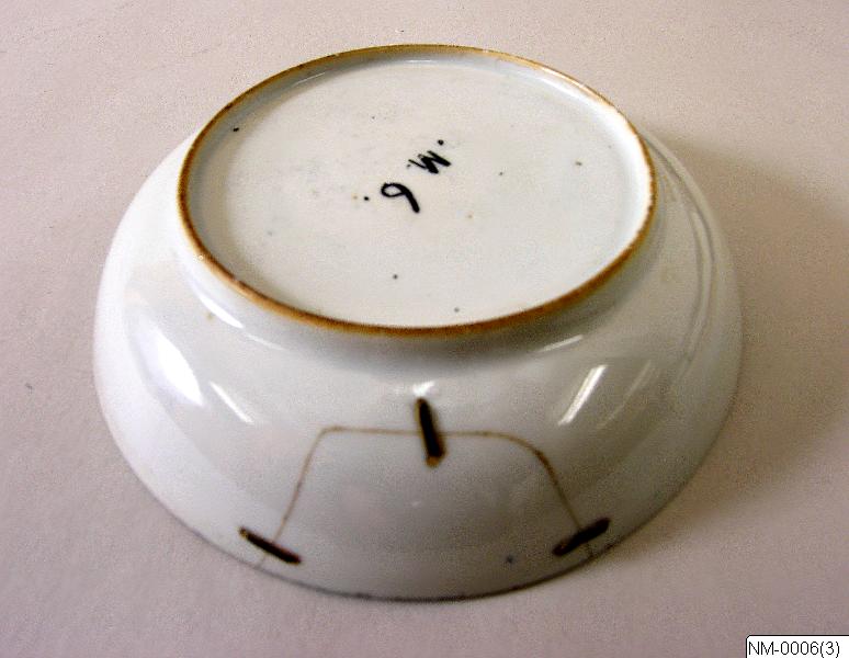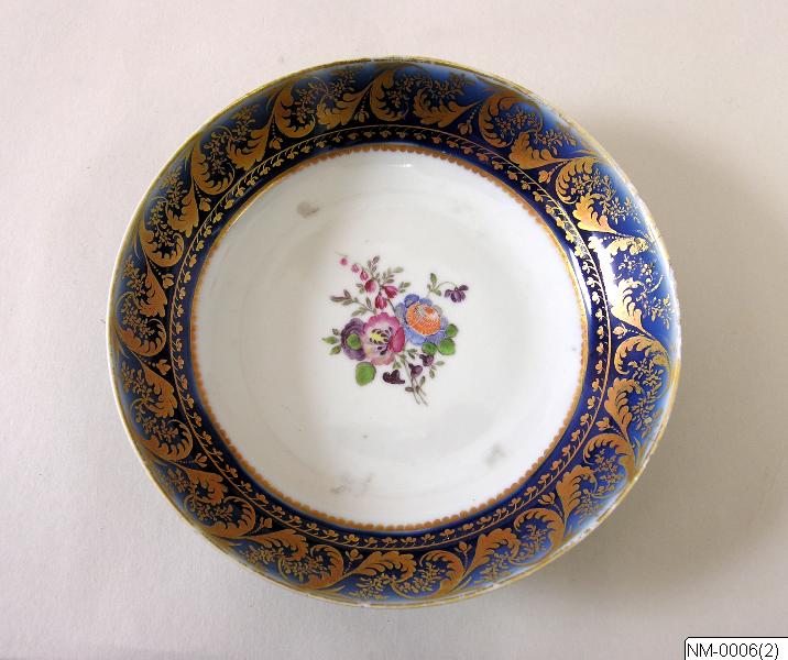• Tekopp med fat. Del av teservice (NM-0001 - NM-0021) av så kallat ostindiskt porslin med dekoration i vitt, blått och guld. Dekor med blommor/blombukett. (Nationalmuseums katalog)