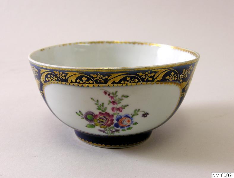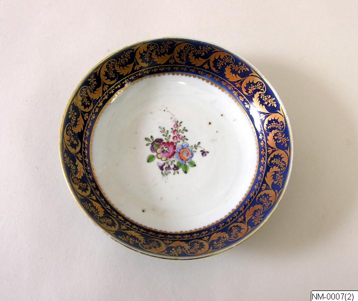 • Tekopp med fat. Del av teservice (NM-0001 - NM-0021) av så kallat ostindiskt porslin med dekoration i vitt, blått och guld. Dekor med blommor/blombukett. (Nationalmuseums katalog)