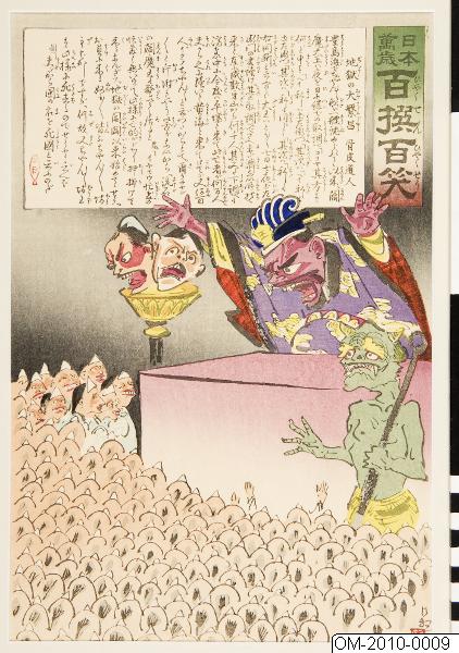 Propagandaträsnitt mot Kina i samband med Sino-japanska kriget (1894–1895). Serien innehåller längre textstycken skrivna av Koppi Dojin (”Mästare skinn och ben”, pseudonym för Nishimori Takeki, 1861–1913). Ur donation av Jan Myrdal, för mer om bilderna se publikationen De hundra skratten: japanska träsnitt som maktens bildspråk av Lars Vargö och Jan Myrdal (inledning av Petra Holmberg). 2011.