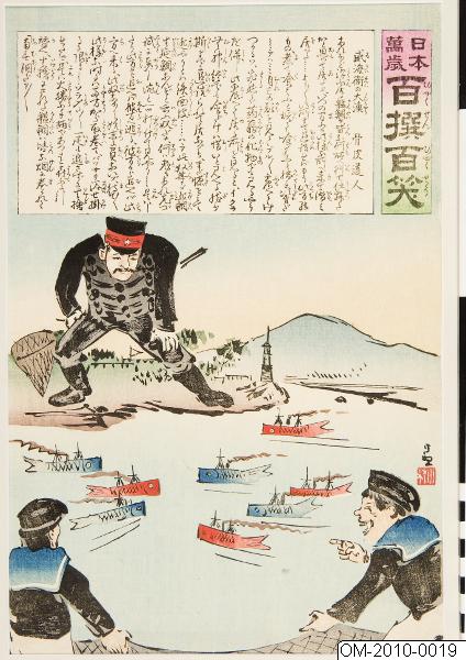 Träsnitt av Kobayashi Kiyochika (1847–1915). Propagandaträsnitt mot Kina i samband med Sino-japanska kriget (1894–1895), serien kallas Länge leve Japan. Hundra segrar, hundra skratt. Serien innehåller längre textstycken skrivna av Koppi Dojin (”Mästare skinn och ben”, pseudonym för Nishimori Takeki, 1861–1913). Ur donation av Jan Myrdal, för mer om bilderna se publikationen De hundra skratten: japanska träsnitt som maktens bildspråk av Lars Vargö och Jan Myrdal (inledning av Petra Holmberg). 2011.