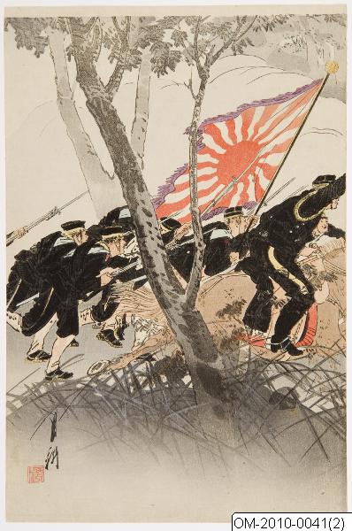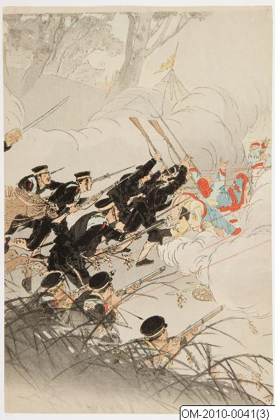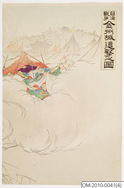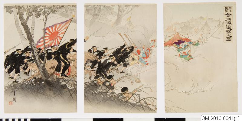 Träsnitt av Ogata Gekko. Triptyk från sino-japanska kriget: Följer efter fienden som drar sig tillbaka vid Jinzhoucheng. (Nisshin sensô Kinshûjô tsuigeki no zu). 1894.
