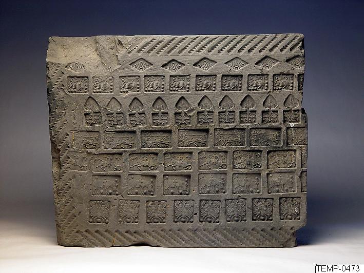 Fragment av gravtegel med mönsterbårder föreställande hästar som drar vagnar, fåglar, rombmönster, häst med bågskytt, oxe, djurmask med ring resp. träd. L: 59 cm. B: 50 cm. Dj: 14 cm. Från möbelmag.