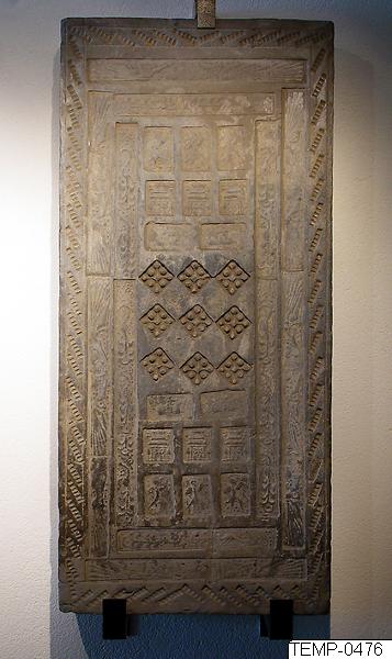 Motiv krigare med spjut, hus, fyrkantsmönster. Otydligt. L: 98,5 cm B: 45,5 cm Dj: 13,5 cm Från bronssalen