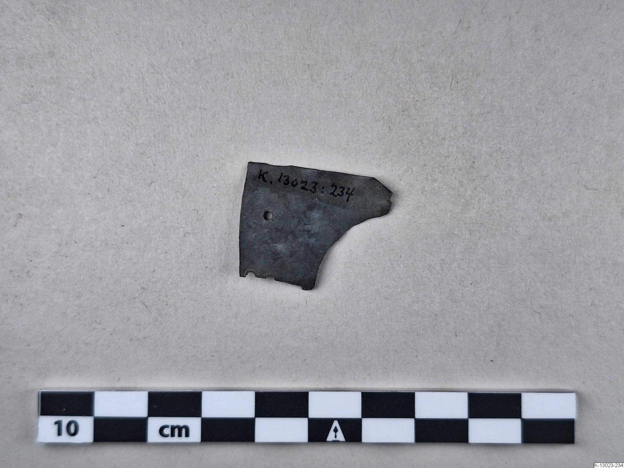 • Bronsblecksbit med ett litet hål och spår av två andra i kanten.
