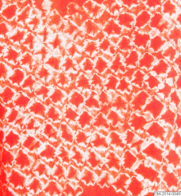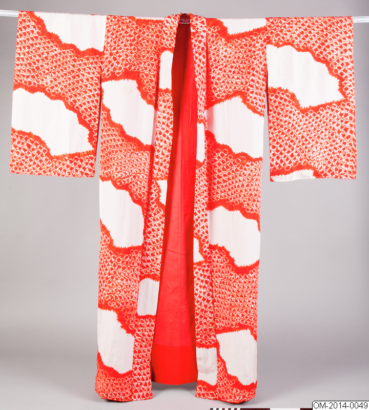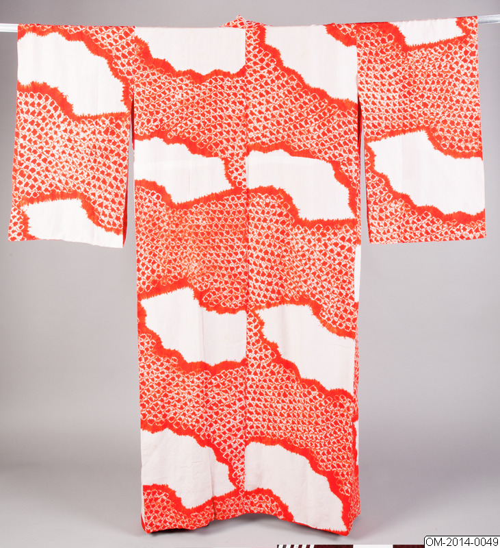 Kimono i rött siden i knuten shibori-teknik med utsparat mönster av solfjädrar.