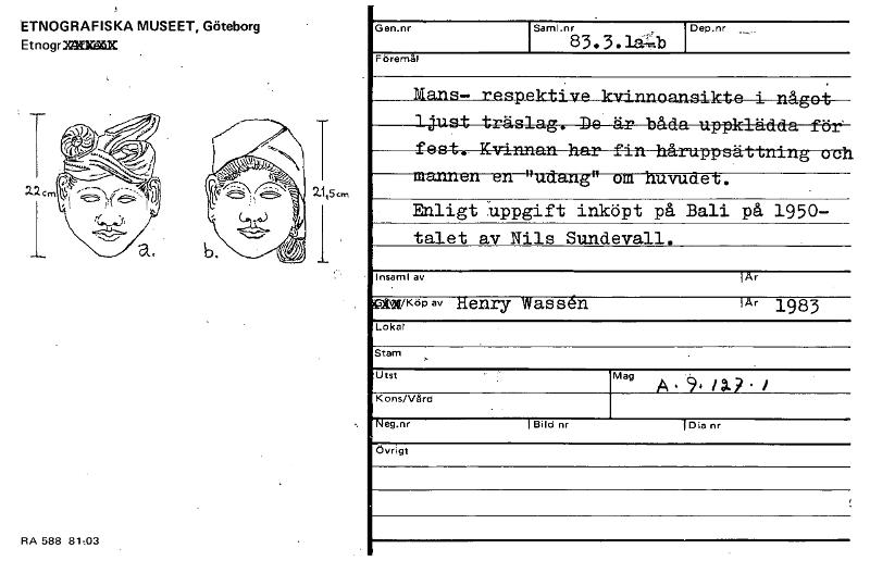 ETNOGRAFISKA MUSEET, Göteborg Et nog ailtrelalIC RA 588 81,03 Gen.nr Saml.nr 83.3.19;4 Dep.nr Föremål Mans- respektive kvinnoansikte i något åruppsättning och --mannen en "udang" om huvudet. Enligt uppgift inköpt på Bali på 1950- talet av Nils Sundevall. Insaml av lAr IMIE/Köp av Henry WassM lAr 1983 Lokal Stam Utst Mn A . 9. / 7 . Kons/Vård Neg.nr II3ildm IDianr Övrigt 2. i5on [ocr]