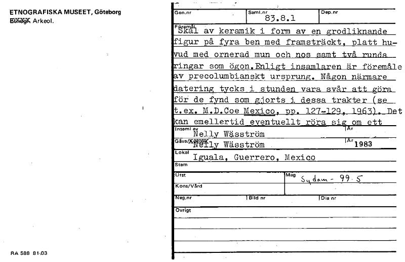 • ETNOGRAFISKA MUSEET, Göteborg Et W Arkeol. RA 588 81,03 Gen.nr Saml.nr 83.8.1 I Dep.nr Fge1L av keramik i form av en grodliknande figur på fyra ben med framsträckt, platt hu- vud med ornerad mun och nos samt två runda ringar som ögon.Enligt insamlaren är föremål av precolumbianskt ursprung. Någon närmare datering tycks i stunden vara svår att göra för de fynd som gjorts i dessa trakter (se t.ex. M... Visa hela