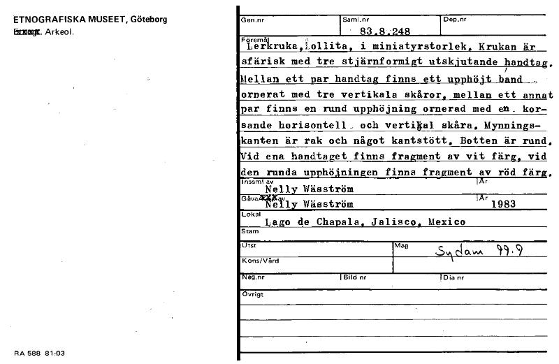 ETNOGRAFISKA MUSEET, Göteborg Etrunt. Arkeol. RA 588 81-03 Gen.nr Saml.nr • 83.8:248 Dep.nr Frekruka,Lollita, i miniatyrstorlek. Krukan är sfärisk med tre stjärnformigt utskjutande handtag 1 Mellan ett par handtag finns ett upphöjt band , ornerat med tre vertikala skåror, mellan ett anna par finns en rund upphöjning ornerad med en_ kor- sande horisontell_ och verti#al skåra. Mynnings- kanten är rak och något kantstött. Botten är rund Vid ena handtaget finns fragment av vit färg, vid den runda upphöjningen finns fragment av röd färg Insaml av I Ar Nelly Wäsström IÅ Gbantyly r Wäsström 1983 Lokal Lago de Chapala. Jalisco Mexico Stam Utst Mag ''r519 Kons/Vård Neg.nr I Bild nr lDia nr Övrigt [ocr]