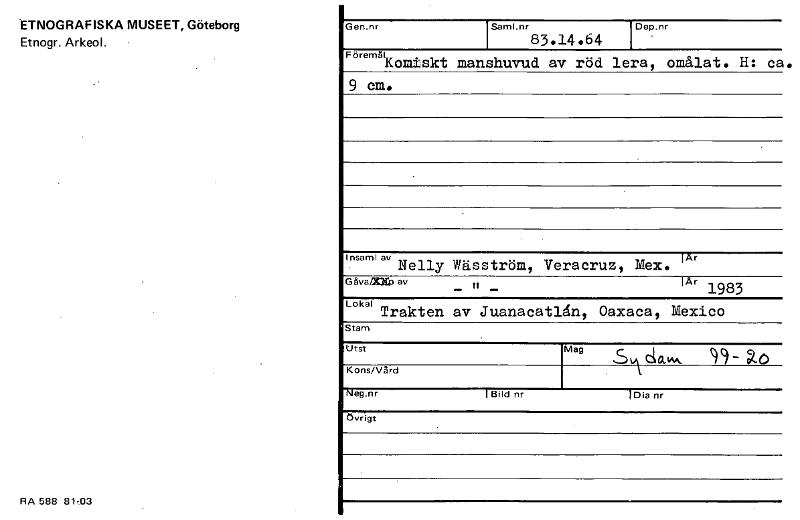 • ETNOGRAFISKA MUSEET, Göteborg Etnogr. Arkeol. RA 588 81-03 Gen.nr Saml.nr 83.14.64 Dep.nr FöremålKomiskt manshuvud av röd lera, omålat. H: ca 9 cm. Insaml av Nelly Wäsström Veracruz Mex. lAr Gåva/M av — Il ,— IÅr 1983 Lokal Trakten av Juanacatlån Oaxaca Mexico Stam Utst Mag dct 99 Kons/Vård Neg.nr 1 Bild nr 1Dia nr Övrigt [ocr]