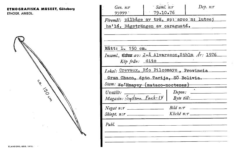 ETNOGRAFISKA MUSEET, Göteborg ETNOGR. ARKEOL. ELANDERS. GBB. 1972. Gen. n:r 95999- Såå l: 'n:r I ' 79 . 10 • 76 Dep. n:r Föremål: pilbåge 'av trä, sp-: - arco -m: lutsej ha 1 lå .•Bågsträngen av caraguatå • Mått: L. 150 cm. Insaml., Qi3pit av: J--ii. Alvarsson,Sthlm År- 1976 Köp från: dito Lokal: Crevaux, l'/Io Pilcomayo , Prövi -neje Gr.. • - • • • • .. _ e : • , Stam: - -•- . • - ..; :-. • • -- - Utställt: I Depon: Byte till: • Magasin • ,Sticla,^4 Fack- IY Negat n:r Bild n:r Kliché n:r Skiopt. n:r Publ. [ocr]