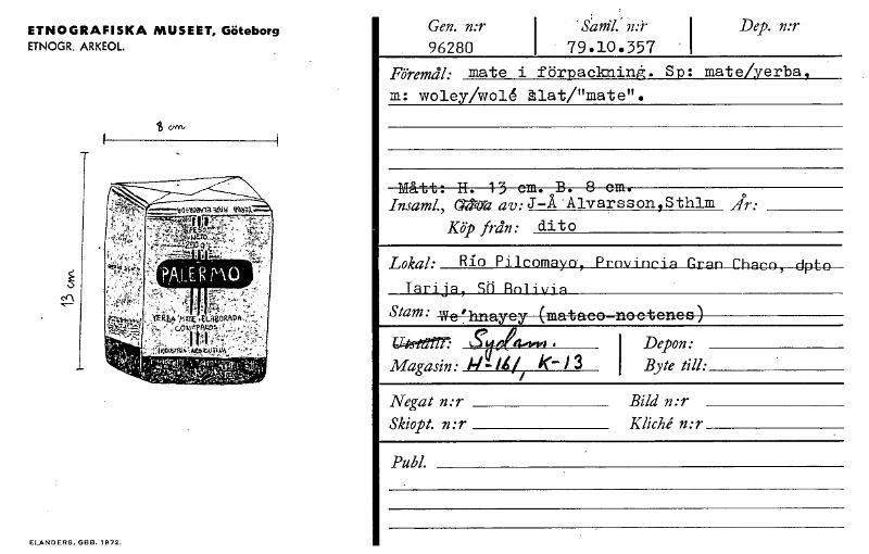 ETNOGRAFISKA MUSEET, Göteborg ETNOGR. ARKEOL. 5 YE-Rh"Ptått .E IBORNDN, ..COrtt5 1Ninnh;; Okt er‘ ELANDERS,WEIB.1972. Gen. n:r 96280 I ' Sam]: n:r I 79.10.357 Dep. n:r Föremål• mate i förpackning. Sp. mat e/yerba 9 In: woley/wol4 ålat/"mate". 13 B. 8 Mått: II. cm. cm. Insaml., GM& av: J —Å • Alvarss on 9 S thlra Ar: Köp från • dito Lokal: Rio Pilcomayo, Prnvincia Gran Chaco, dpto Tarija, SM Rnlivin Stam (mataco—no tence ) We ' hnaycy c 4.4st21777 I Depon: Byte till: Magasin 1-1-14/K- 13 I Negat n:r Bild n: r Kliché n:r Skiopt. n:r Publ. [ocr]