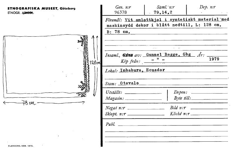 • ETNOGRAFISKA MUSEET, Göteborg ETNOGR. ELANDERS, GBB. 1972. Gen. n:r 96378 821m1.. I . 79141.712:r Dep. n:r Föremål: Vit omlottkjol i syntetiskt materiarmei maskinsydd dekor i blått nedtill. L: 128 cm. B: 78 cm. Insaml., «d» av: Gunnel Bagge, Gbg jr. Köp från: _ ti _ 1979 Lokal: Imbabura, Ecuador Stam: Otavalo Utställt: I Depon: I Byte till: Magasin Negat n:r Bild n:r Kliche. n:r Skiopt. n:r Publ. ... Visa hela