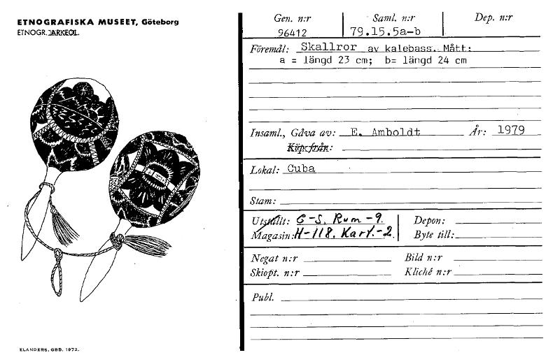 • ETNOGRAFISKA MUSEET, Göteborg ETNOGR.:~(31. ELANDERS, GEIB, 1972. Gen. n:r 96412 I • Sand. mr I 79.15.5a—b Dep. n:r Föremål- Skallror av kal ehass-- Mått a = längd 23 cm; b= längd 24 cm Insaml., Gåva av: E. Ambol dt, jr: 1=9___ iftipc~ ' Lokal- Cuba Stam• Ut It: C—S, le"1-1. Depon: Byte till: Magasin :Hr /1 i. XQ rr -2. Negat n:r Bild n:r Kliche. n:r Skiopt. n:r Publ. [ocr]