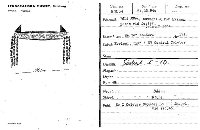 ETNOGRAFISKA MUSEET, Göteborg ETNOGR. AKIMX C-3 Gen. n:r Saml. n:r 1 Dep. n:r 80264 , —51.23-.940 1 Föremål: Tåli c-Mia , huvudring. för kvinna. Bäres vid fester. Orig,nr 1o54 Walter Kaudern. 1918 Ins...