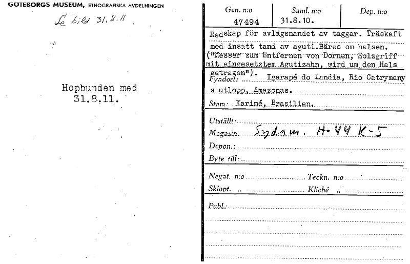 Hopbunden med 31.8.11. Gen. n:o 47494 Samt. n:o 31.8.10. Dep. n:o RedskaP för avlägsnandet av taggar. Träskaft med insatt tand av aguti.Bäres om halsen. (nlUsser -- -zum-Entfernen-von-Dornen, Holzgriff mit_eingesetztem_Agutizahn, wird um den Hals garn"). Igarape do Iandia, Rio Catrymany s utlopp, Amazonas. Starn • Karimå, Bradaien. Utställt • Magasin: 3-12 tt 61 im fri- tf Cl le - Depon.: Byte till: Negat. n:o Teckn. n:o Skiopt. „ Kliché ,. Publ.: GOTEBORGS MUSEUM, ETNOGRAFISKA AVDELNINGEN -5", [ocr]