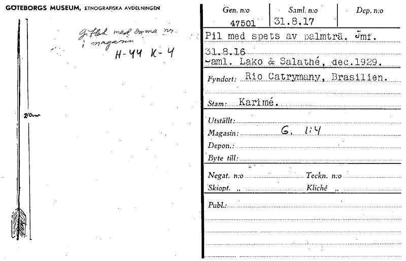 • GOTEBORGS MUSEUM, ETNOGRAFISKA AVDELNINGEN (9'11.41 cO2r 97t4 -12A7 Gen. n:o 47501 Pil med spets av oalmträ. Saml. n:o 31.8.17 Dep. n:o amt. 3_1_8.16 �aml. LaKo & Salathe, dec.1929. Fyndort: Rio Catr... Visa hela