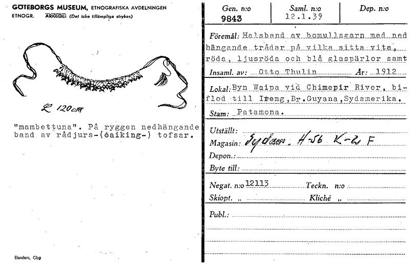 GOTEBORGS MUSEUM, ETNOGRAFISKA AVDELNINGEN ETNOGR. (Det icke tillämpliga strykas) "mambettuna". På ryggen nedhängande band av Tådjurs-(ciaiking-) tofsar. Elandars, Gbg Gen. mo 9843 Saml. n:o 12.1.391 w Dep. o Föremål. fisiBbend av bom.uljs,7arn med ned hAwqnde trådar nA vilka fittasvita, röda, ljusröda och blå glaspärlor samt hisaml. av: Otta _Ihul in Är: .1U2 Lokal: Byn Waioa vid Chimepir River, bi- flod till Iteng,Br.Guyana,Sydamerika. Stam: Patamona. Utställt: Magasin: el:~ ,i4,r6 4 F Depon.: Byte till: Negat. n:o12113 Teckn. wo . Skiopt. „ Kliché . AM. [ocr]