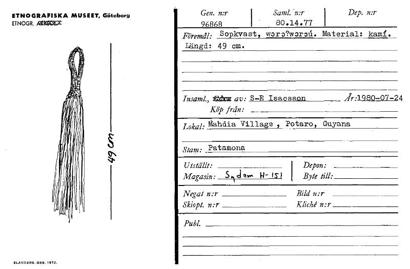 • ETNOGRAFISKA MUSEET, Göteborg ETNOGR. ANZIKEMC ELAND ERS, GBB. 1972. Gen. n:r 96868 I Saml..n:rI 80.14.77 Dep. n:r Föremål• Sopkvast, woro?woroll. Material: kand. Längd: 49 cm. Insaml., kkaz av: S-E I... Visa hela