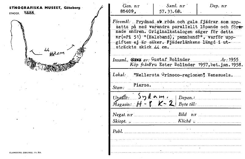 ELANDERS. GBG 502. Il. 53. Gen. n:r . . 85409, I • Sam!. n:r « I 57.33.68: I Dep. n:r • Föremål: ....Prydnad..ai»..röda .och..gula.. fjädrar...som..upp, satts på med varandra parallellt löpande och före nade snören. Originalkatalogen- säger för detta nr(-=Pi---51) -n (Halsband); pannband?", varför upp- giften.- ej är --säker. Fjäderlänkens..längd• i ut- sträckts skick 44 cm. Insaml., 1WX av: Gustaf Bolinder Ar:19.55... Köp frånFru Ester Bolinder 1957,bet.jan.1958 Lokal: .. ."Mellersta Orinoco-regionen..Venezuela. Piaroa. . • , Stam: , • S Uyållt : al9«.- Qv wi k Magasin: • H - tr e- 2. Depon.: Byte till: Negat. n:r Bild n:r Skiopt. „ Kliché ,, . . Publ. ETNOGRAFISKA MUSEET, Göteborg ETNOGR. [ocr]