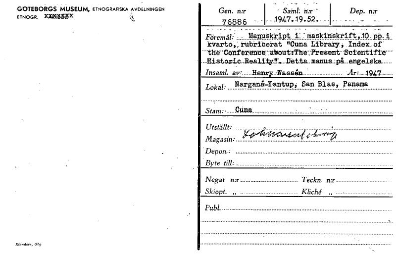GOTEBORGS MUSEUM, ETNOGRAFISKA AVDELNINGEN ETNOGR. ICIKVSPC Mandels, Gbg Gen. n:r 7 68 8 6 - - - Said ki:r. ' -- 1947.19.52._ ._ Dep. n:r ,.. __. Föremål: . .. Manuskript. i: : maskinskrift 710 - pp* i kvarto ,; rubriderat "Cuna Library, . Index. Of . -the Confer-enrwsaboutrThe.....fte-sent-Scientific---- ....Iliataric..Reality!!....Detta..manus.:på..engelska Insaml. av • Henry liassen • Är 1947 Lokal: Narganb-Yentup i San Blas, Panama Stam:. Cuna . - . • - Utställt: ., Magasin: Depon.: Byte till: Negat n:r Teckn. n:r • Skiopt. „ Kliché. „ Publ. • [ocr]