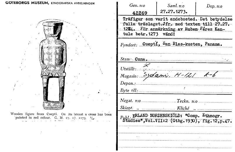 GÖTEBORGS MUSEUM, ETNOGRAFISKA AVDELNINGEN Wooden fighre from Cuepti. On its breast a cross has been painted in red colour. G. M. 27. 27. 1273. 1/4. Gen. n:o 42269 Saml. n:o 27:27.1273. Dep. n:o Träfigur-som 'varit.andebåstad.'Det betydelse -fulIa-träsIagetAfr, med texten-tilI 27:27. - 12$4. För...anmärknin': g, av Ruben- 2gårez Kan- . tule betr. .1273 vänd! Fyndort: Cueptk, San. Blasrkusten, Panama. Stam • , Cuna. • • • ,. Utställt: • j.- - , . Magasin: -;/42/4.4 Depon.: Byte till: Negat. n:o Teckn. n:o , Skiopt.„ Kliché „ p Al .ERLAND' NORDENSKIÖLD: "Comp. Ethnogr. ätädiesn,Völ:VIIt2.- (Gtbg.1930)-, • fig. 12,p.47. [ocr]