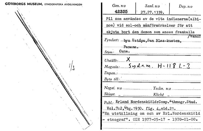 GOTEBORGS MUSEUM, ETNOGRAFISKA AVDELNINGEN. Gen. n:o 42335- Saml. n:o - 27.27.1339. Dep. n:o Pil som användes av de vita indianerna(albi- nos) vid sol-och månförmörkelser för att skjuta bort den demon som anses framkalla /vindi Fyn d or t : ---lvia-U s talpu.,San..Blas-lcusten, Panama. stäm. Cuna• Utställt: X Magasin • 51 it °\ '41 , H- 1 f g L - Depon. • Byte till: Negat. n:o Teckn. n:o Skiopt. „ Kliché „ Pub!. Erland Nordenskiöld:Comp.nthnogr.Stud. Vo1,7:2,Chpg.1930. fig. 4,sid.21. "En utställning om och av Erl.Nordenskiöld - etnograf". OIH 1977-05-17 - 1978-01-08. [ocr]Stäng