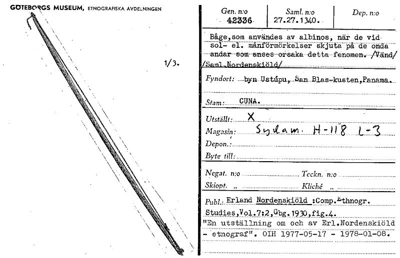 GOTEBORGS MUSEUM, ETNOGRAFISKA AVDELNINGEN Gen. n:o , 42=6. Saml. n:o . 27.27.1340._ Dep. n:o Båge,som användes av albinos, när de vid- sol- el. månförmörkelser skjuta på de onda andar-som-enses-orsaka-detta-fenemenw-/Vänd/ B ..ble 0-f , "_1 Fyn d or t : - byz-4, -U-s tlipu,---b-an--Blas,kusten,Fanama.... Stam • CUNA. _ • Utställt. X Magasin: 5 L-), i. A kl , L , Depon.: Byte till: Negat. n:o Teckn. n:o Skiopt. „ Kliche. ” Abl. Erland Nordenskiöld :Comp..11thnogr. - 1978-01-08. Studies,Vol.7:2,Gbg.1930,fig.4. "En utställning om och av Erl.Nordenskiöld --etnograf". OIH 1977-05-17 1/3. [ocr]