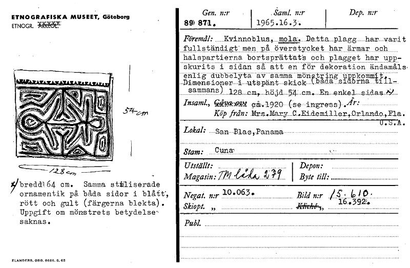 ETNOGRAFISKA MUSEET, Göteborg ETNOGR. TcfR-W /2_8. „, /bredd-164 cm. Samma stiliserade ornamentik på båda sidor i blått', rött och gult (färgerna blekta) . Uppgift om mönstrets betydelse- saknas . ELANDERS. GOD. 6626. 6. 65 8 9) 8 Gen. 4 , 71: i' i . Sard. n:r 1965.16.3. I Ap. n:r Föremål: Kvinnoblus, mola. Detta plagg har var: fullständigt men på överstycket har ärmar och halspartierna bortsprättats och plagget har upp. skurits i sidan så att en för dekoration ändamå: enlig dubbelyta av samma mongtring 1,1 pkommit, Dimensioner i utspänt skick k bada sl orna till- sammans) 128 .cm, hilidd 54 cm. :En enkel sidas InunK Q uå.1920 (se ingress) .-17.: Köp från: Mr s.NAry G ..Ed ftemill er , Orlando ,Pb U•b•J Lokal: San Blas'Panama Stam:. Cuna ;- Utställt: -U Magasin: YI.4 ) I Depon: i Byte till: Ahregat. n:r10.063. Bild n:r i .5 ' lo i 0 16.392. Skiopt. „ Mieir64.3, Publ. t s. [ocr]