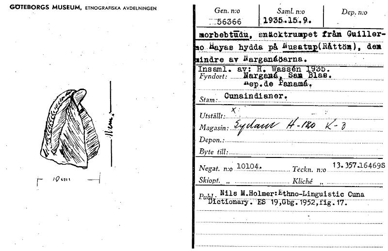 GOTEBORGS MUSEUM, ETNOGRAFISKA AVDELNINGEN Gen. n:o I:5636,6 Samt. n:o 1.93.15.. 9.. Dep. n:o morbebtridn, snäcktrumpet från Guiller- _iiayas hydda på kilisatup(lattön), den nare av liarganOiarna. In...