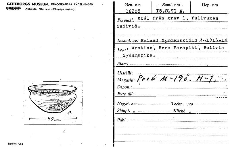 GOTEBORGS MUSEUM, ETNOGRAFISKA AVDELNINGEN 44148401 ARKEOL. (Det Icke tillämpliga strykas) 5' 7, Elanders, Gbg Gen. n:o 16305 Saml. n:o 1-5.2 91 k. Dep. n:o Föremål: Skål från grav 1 , fullvuxen individ, Insaml. av: Erlan.d...Nord.e.n.s.kiäld Ar:19.13.r1.4. Lokal: Aratico, övre Sydamerika. Stam: Parapiti , Bolivia Utställt: Magasin: t 4,--1' 411 Depon.: Byte till: ° • Negat. n:o Skiopt. „ Teckn. n:o Kliché „ Publ.: [ocr]